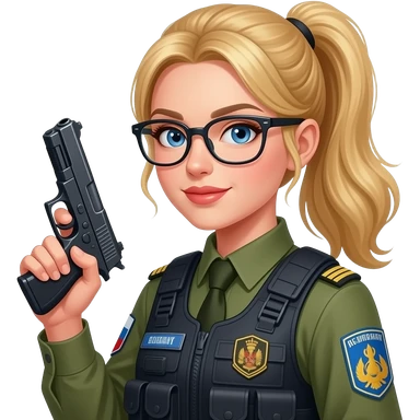 Sexy girl, blonde, side ponytail, blue eyes, slavic, glasses, security in military cloth, holding gun, emoji