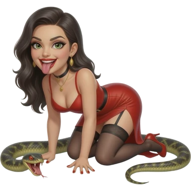 Prostitue with a snake tongue crawling around her body ,and reptilian eyes wearing red lipstick and has an evil smile lust. red sexy dress emoji