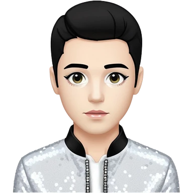 Sugar Bones, Male Electropop Singer from Confidence Man with black hair with white highlights, white sequin outfit emoji