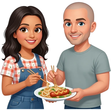 Mexican woman and white man with shaved head sharing pad thai made with hot dogs emoji