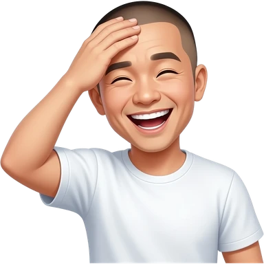 asian guy with shaved head with palm on foreheard laughing shaking his head with white t shirt on emoji