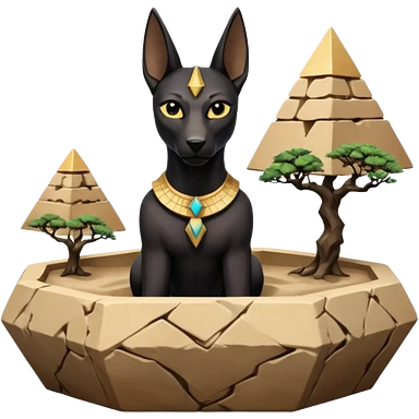 Kindly alien Protecting silky black-haired tiny statuette scale Anubis and pyramid scenery stone-age cracked irregular bonsai pot emoji