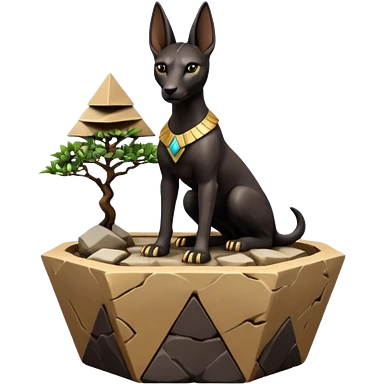 Kindly Protecting silky black-haired tiny statuette scale Anubis and pyramid scenery stone-age cracked irregular dodecagon bonsai pot emoji
