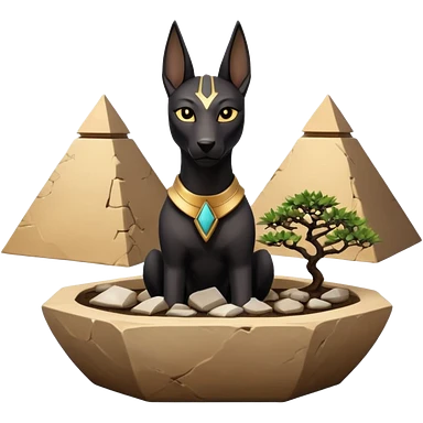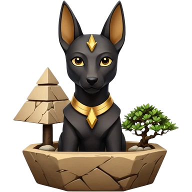 Esthetically Therapeutic silky black-haired tiny statuette young miniature Anubis pyramid scene stone-age cracked irregular dodecagon bonsai pot emoji