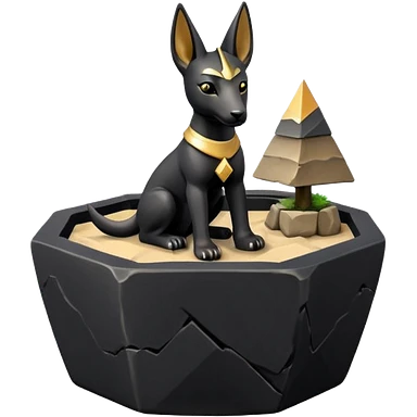 Therapeutic silky black fur tiny statuette young Anubis pyramid scene stone-age cracked irregular dodecagon bonsai pot emoji