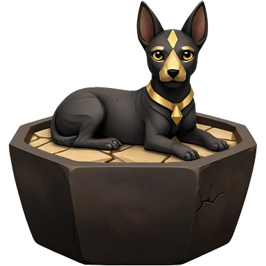 Soothing silky black fur tiny statuette Anubis puppy pyramid scene stone-age cracked irregular dodecagon bonsai pot emoji