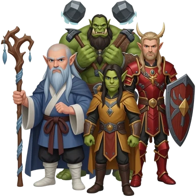 A male elf kungfu master with a staff and long silver blue hair, a male orc shaman with hammers in each hand, and a male elf paladin in red armor, as a group emoji