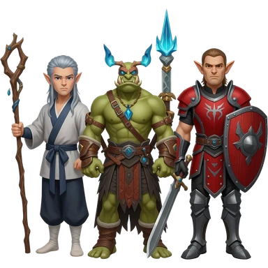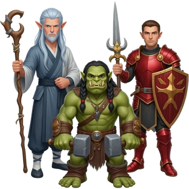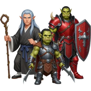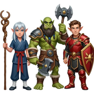 A male elf kungfu master with a staff and silver blue hair, a male orc shaman with weapons in each hand, and a male elf paladin in red armor carrying a sword and shield, as a group emoji