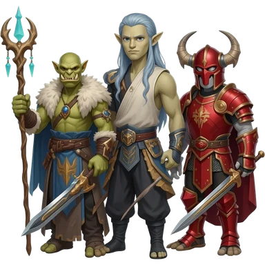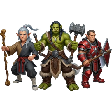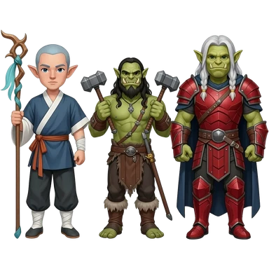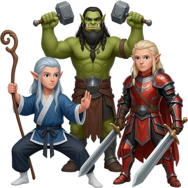 A male elf kungfu master with a staff and long silver blue hair, a taller male orc shaman with hammers in each hand, and a male elf paladin in red armor with a two handed sword, as a group emoji