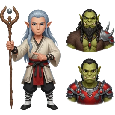 A male elf kungfu master with a staff and long silver blue hair, a male orc shaman with weapons in each hand, and a male elf paladin in red armor, as a group emoji