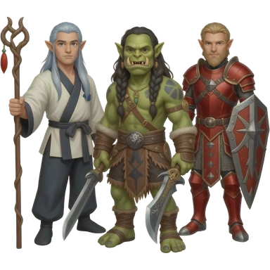 A male elf kungfu master with a staff and silver blue hair, a male orc shaman with maces in each hand, and a male elf paladin with long hair in red armor, as a group emoji