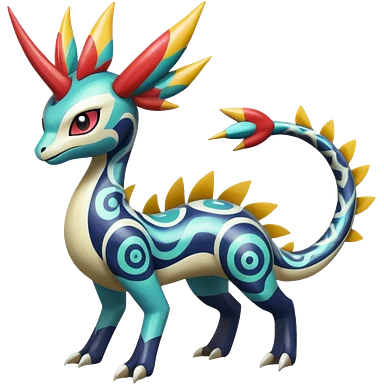 zig-zag-patterned clownish colorful exotic fruity tribal tropical hot swirl-marked Meloetta-Dialga-Salamence-Giratina-Noivern-Pokémon-Fakémon-fusion-hybrid-creature emoji