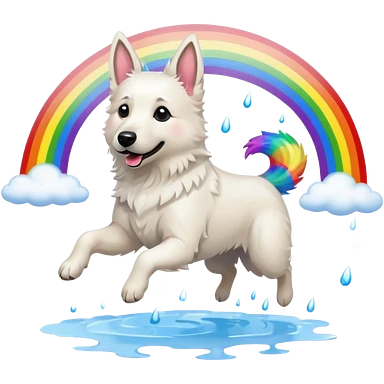 White belgian Shepard jumping over Rain puddles. There is a rainbow in the sky emoji