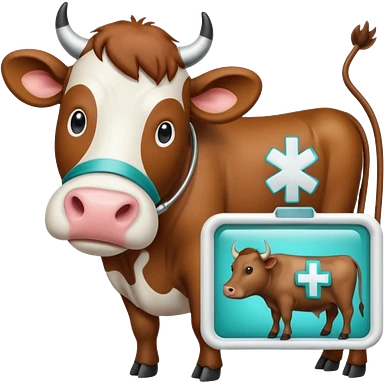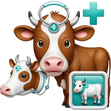 Emoji-style icon of a cow and buffalo with a medical cross and scan frame overlay, representing disease detection and health analysis. Friendly, clean, rounded design, clear at small sizes, teal and white accents, no text, transparent background. emoji