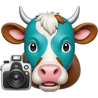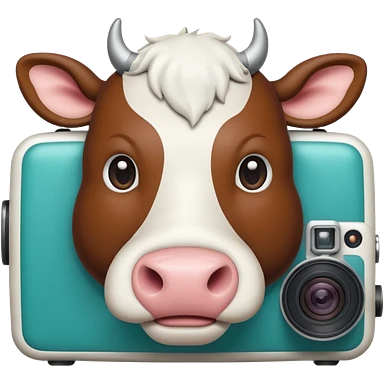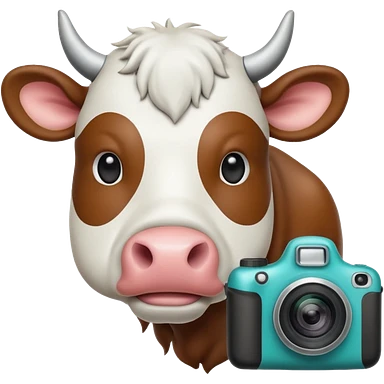 Emoji-style icon of a cow and buffalo with a camera or scan frame, representing image upload for breed detection. Simple, friendly, rounded design, clear at small sizes, teal and white accents, no text, transparent background. emoji