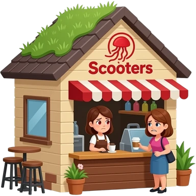 A coffee shop named "Scooters" with a pitched roof with grass growing on it. The logo is red with lettering and a jellyfish. the building walls are tan and brown. A lady with red stressed eyes is working the counter. Another lady, even more stressed and mad buys coffee. emoji