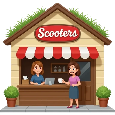 A coffee shop named "Scooters" with a pitched roof with grass growing on it. The logo is red, the building walls are tan and brown. A lady with red stressed eyes is working the counter. Another lady, even more stressed and mad buys coffee. emoji