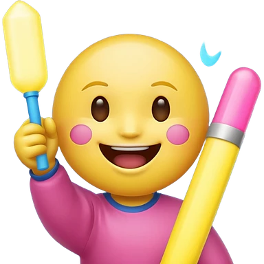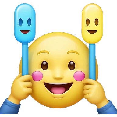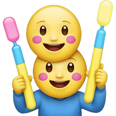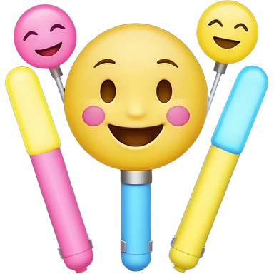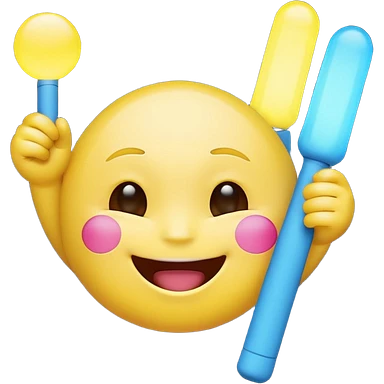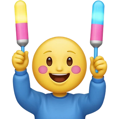 An excited yellow emoji face with closed smiling eyes and blushing cheeks, cheering enthusiastically while holding up two glow sticks (one blue, one pink). It represents high energy, fandom, and celebration. emoji