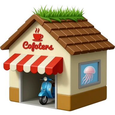 A small coffee shop named scooters with a pitched roof with grass growing on it. The logo is red, the building walls are tan and brown. A drive-through window flanks the front. A jellyfish is in the drive-through. emoji