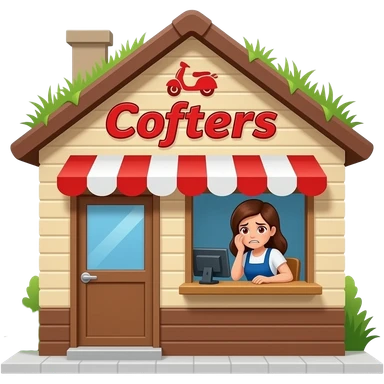 A small coffee shop named scooters with a pitched roof with grass growing on it. The logo is red, the building walls are tan and brown. An stressed woman with red bloodshot eyes is working the drive-through window. Another lady, even more stressed and seemingly addicted to coffee makes a purchase. emoji