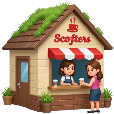 A small coffee shop named scooters with a pitched roof with grass growing on it. The logo is red, the building walls are tan and brown. A stressed lady with red eyes is working the drive-through window. Another lady, even more stressed and seemingly an addict buys coffee. emoji