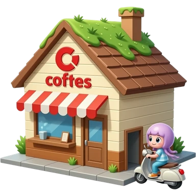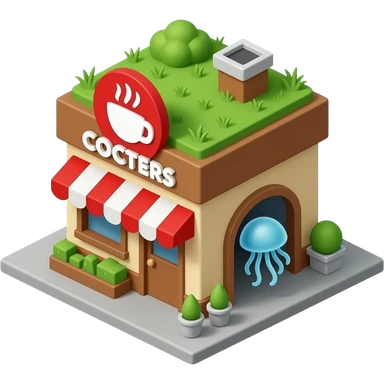 A small coffee shop named scooters with a roof with grass growing on it. The logo is red, the building walls are tan and brown. A jellyfish is in the drive-through. emoji