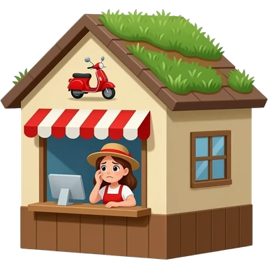 A small coffee shop named scooters with a pitched roof with grass growing on it. The logo is red, the building walls are tan and brown. An extremely stressed woman with bloodshot eyes is working the drive-through window. emoji