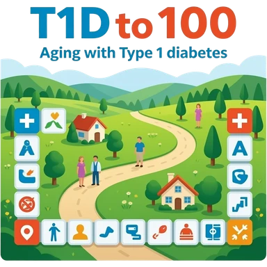 journey on a game board about Type 1 diabetes and aging with less roads, less buildings (hospital, places to live, advocacy, physical changes, to share knowledge and ways of coping, energetic with text: T1D to 100 and subtext Aging with Type 1 diabetes, easy for seniors to see emoji