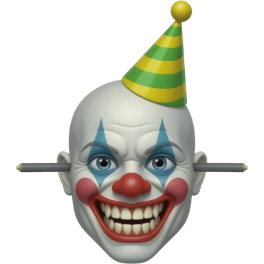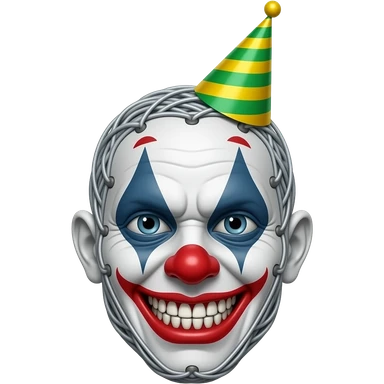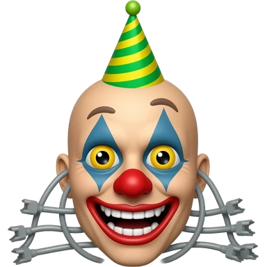 Grey wires with a bald animatronic clown face and no lips with sharp teeth And a green and yellow stripy party hat emoji
