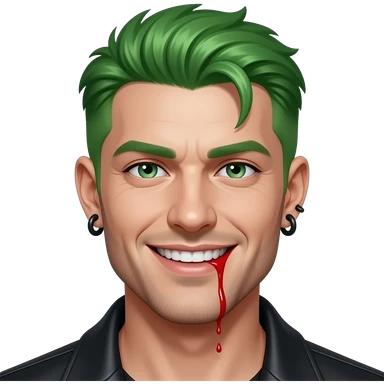 Handsome man with green hair, sharp teeth, a red line across his throat that's dripping like sauce, and black ear stretchers, smirking seductively. emoji