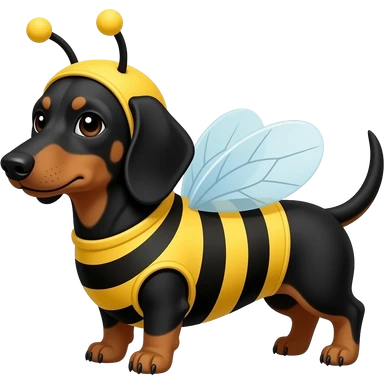 Short-haired dachshund with black/brown fur wearing bee costume emoji