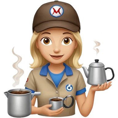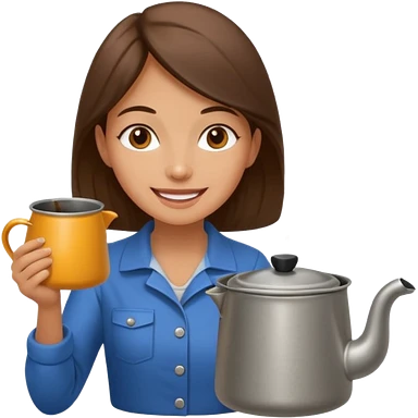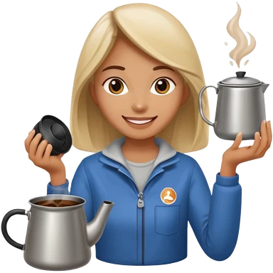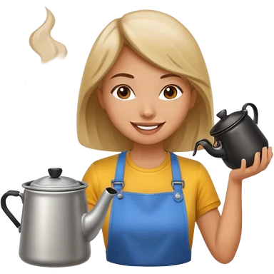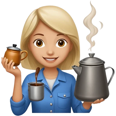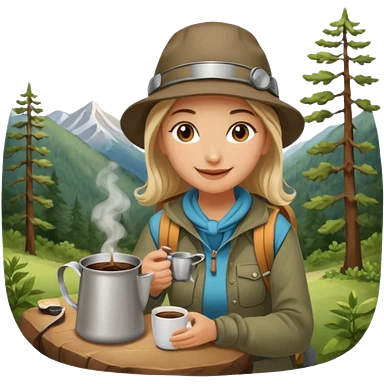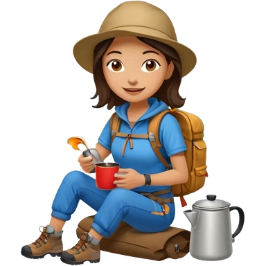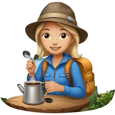 A cheerful female camper brewing coffee in a small metal pot sitting emoji