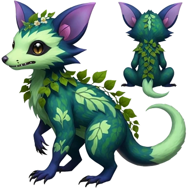 Realistic Sharp swampy realistic mossy grassy elemental ivy floral detailed Colorful translucent luminescent glowing Trico-Noibat-batty-Sergal-Furret-Ferret-Wolverine-Vernid-furry-fursona-fusion-Fakemon-animal-hybrid-creature, full body emoji