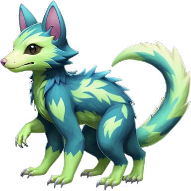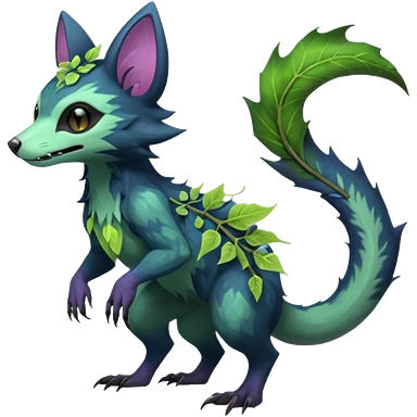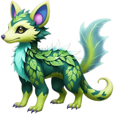 Realistic Sharp swampy mossy elemental ivy detailed Colorful translucent luminescent glowing Trico-Noibat-batty-Sergal-Furret-Ferret-Wolverine-Vernid-furry-fursona-fusion-Fakemon-animal-hybrid-creature, full body emoji