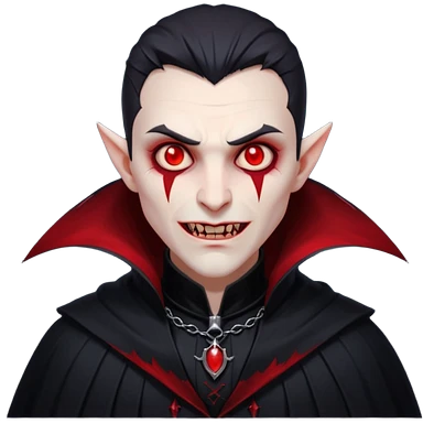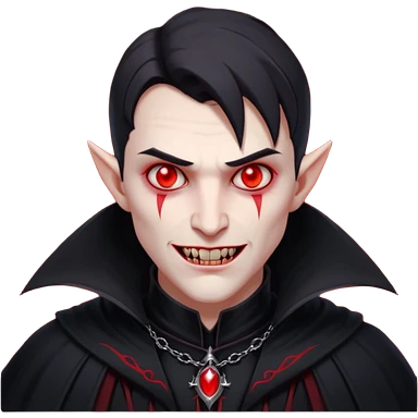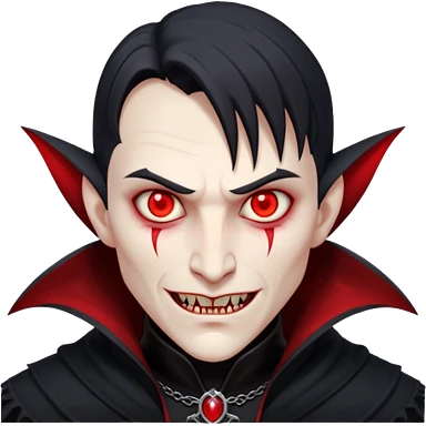 “A pale face with glowing red eyes, a sharp fanged smirk, and dark shadows around the face. It has a tattered black collar and a gothic, grungy vibe with hints of crimson for a vampire aesthetic.” emoji