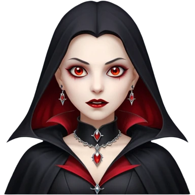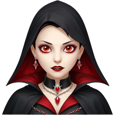 vampire village woman portrait, head and shoulders only, dark gothic cloak collar, sharp fangs, red glowing eyes, elegant yet eerie expression, subtle jewelry, 3D cartoon, mobile game icon style, clean background, no text, no watermark emoji