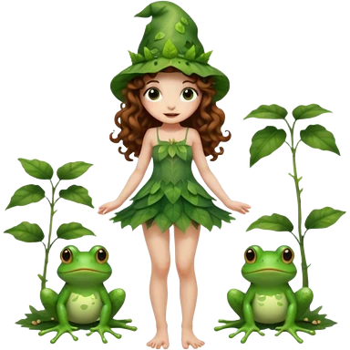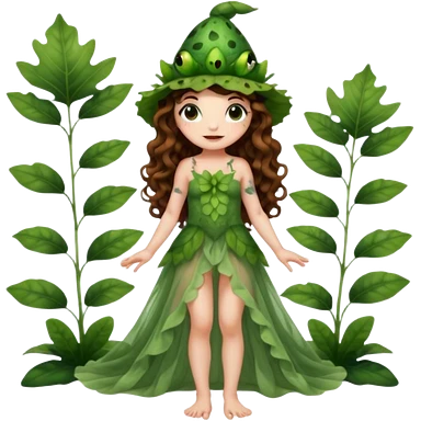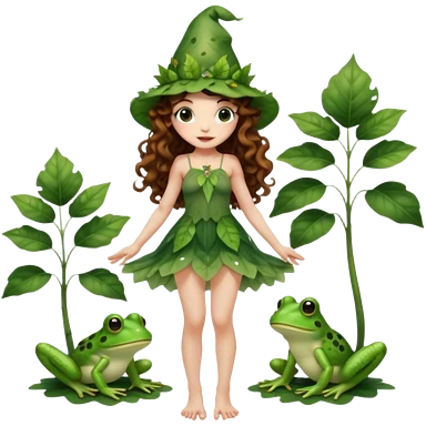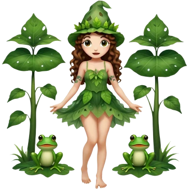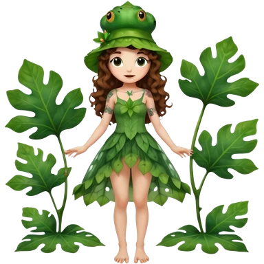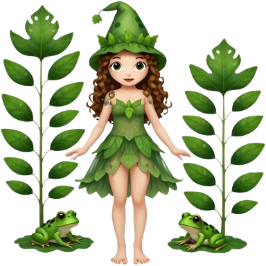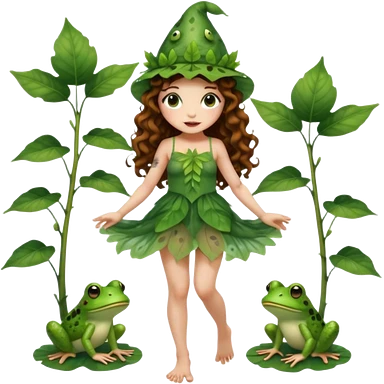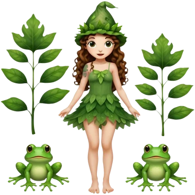 full body woman long curly brown hair brown eyes white skin tattoos wearing cute frog hat and sheer leaf dress, barefoot, flirty forest fairy pose emoji