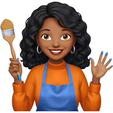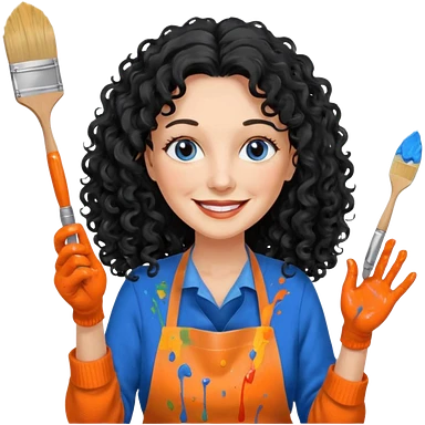 FEMME FRISÉ 60 ANS CHEVEUX NOIR FRISÉ ONDULÉ TRÈS LONG , SOURIANTE AVEC CHANDAIL ORANGE , YEUX BLEU ET UN PINCEAU À LA MAIN LA MAIN AVEC 5 DOIGT SEULEMENT ET TABLIER emoji