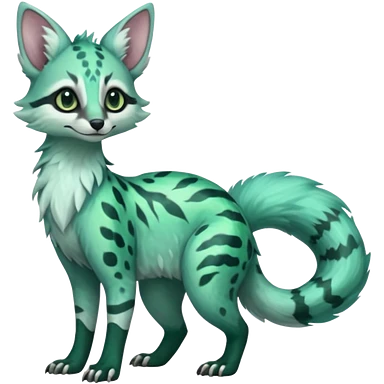 Shiny glossy colorful iridescent Feral Rare Fantasy minty-cyan pastel-seafoam-green Hunter-forest-green Vernid-Sergal-Genet-Trico-species by LiLaiRa, random markings, tufted tail, tufted ears, full body emoji