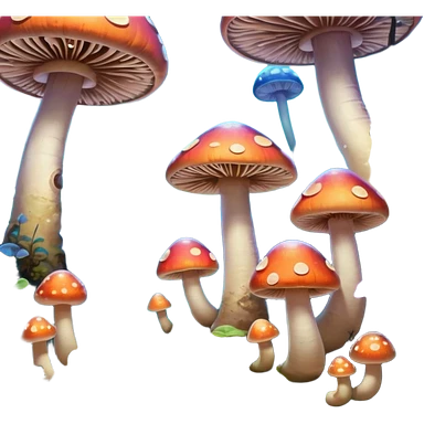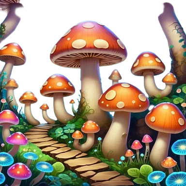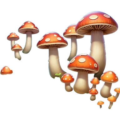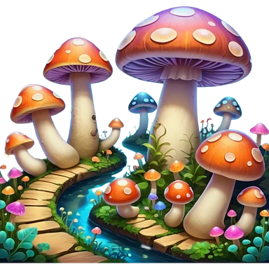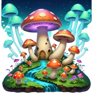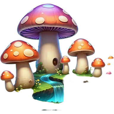 "A whimsical mushroom world filled with giant glowing mushrooms, soft bioluminescent spores floating through the air, and friendly oversized snails with colorful spiral shells exploring the landscape. Fantasy atmosphere, vibrant colors, dreamy lighting, highly detailed emoji