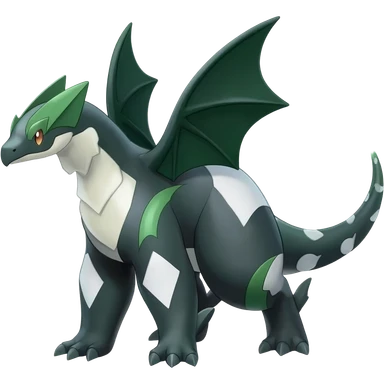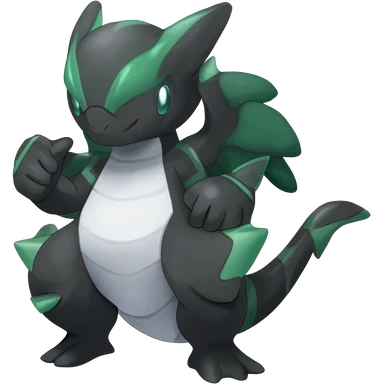 Shiny Black Grey White and Dark-Green Axew-Tyranitar-Larvitar-Flygon-Scyther-Pokémon-Fakémon-Digimon-fusion-creature, full body emoji