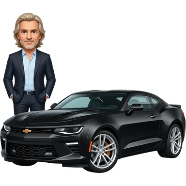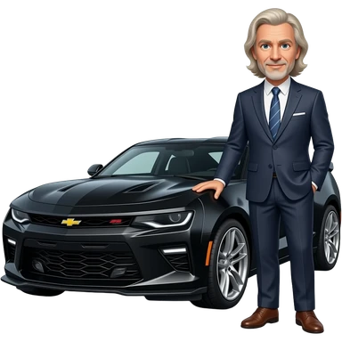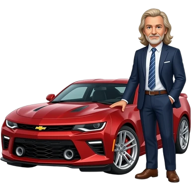 White guy long blond hair in his 50'sdressed nice and nice car can u make the car 2019 camaro ss with chrome wheels shiny paint emoji