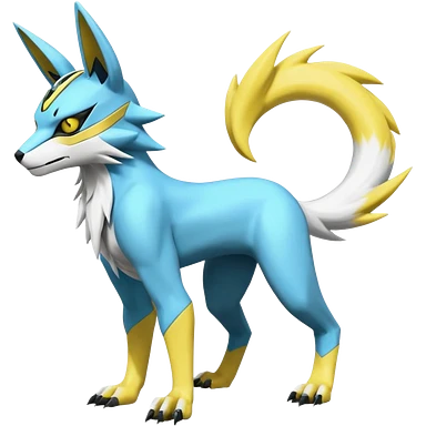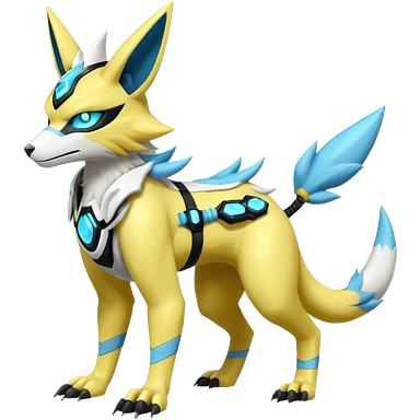 Shiny cyan yellow white electric complex futuristic white-cyber-masked Zeraora-Renamon-Electrike-Umbreon-Lombax-Weregarurumon-fusion-creature (full bodyemoji