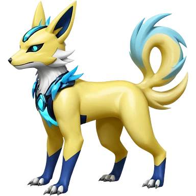 Shiny cyan yellow white electric complex futuristic white-cyber-masked Zeraora-Renamon-Electrike-Umbreon-Lombax-Weregarurumon-fusion-creature (full body emoji | AI Emoji Generator