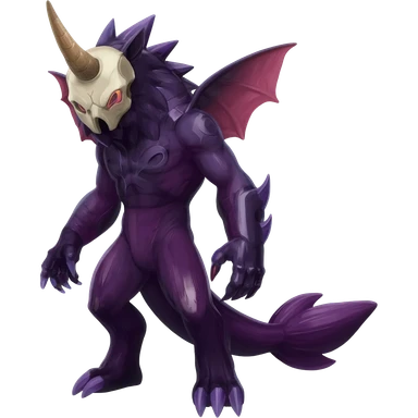 Shiny Dark Edgy Duskull-Noivern-Incineroar-Salandit-Inteleon-Amaura-Fakémon-hybrid-creature (full body) with a horned bird-skull-mask emoji