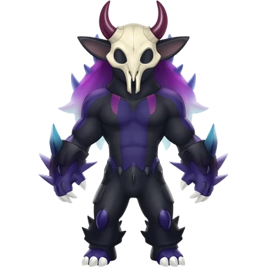 Shiny Dark Edgy Duskull-Noivern-Incineroar-Salandit-Inteleon-Amaura-Fakémon-hybrid-creature (full body) with a horned bird-skull-mask emoji