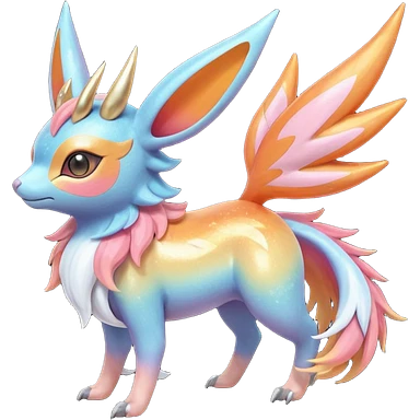 Shiny realistic cool beautiful iridescent light warmly colored reddish-orange-gold-gradients neon vibrant colorful pastel flourishing flurry fuzzy Nargacuga-Palkia-Sylveon-Meloetta-Noibat-fusion-animal-Fakémon-hybrid-creature, by griffsnuff emoji