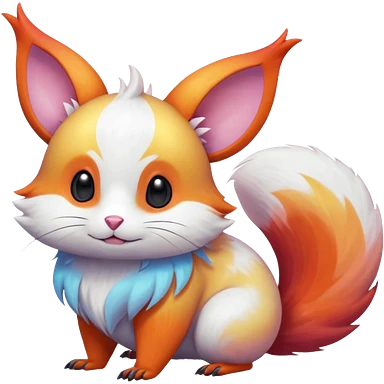 Shiny iridescent light warmly colored reddish-orange-gold-gradients neon vibrant colorful pastel flourishing flurry fuzzy Minccino-Pachirisu-Furret-Palkia-Meloetta-Noibat-fusion-animal-Fakémon-hybrid-creature, by griffsnuff emoji