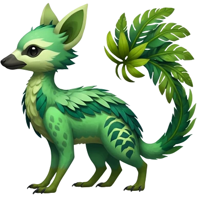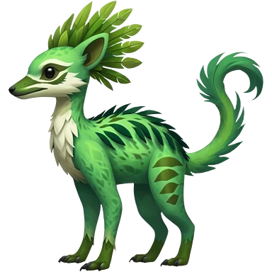 Tropical feathery shamanic cultural Greenish beautiful handsome gorgeous aesthetic colorful vibrant Vernid-Trico-species-Fakemon-creature by LiLaiRa, 4 legs, 1 tail, random markings, (full body) emoji