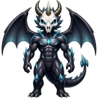 Shiny Dark Edgy Inteleon-Amaura-Fakémon-hybrid-creature (full body) with a horned animal-skull-mask emoji